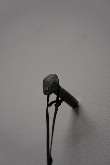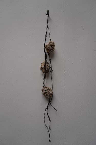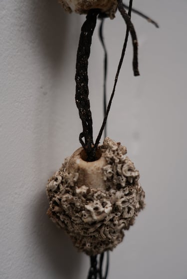 Algues, flotteurs en plastique, habitats calcaires de serpulidae, clou en cuivre