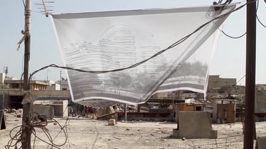Sur le toit du marché Djibi Saar, j’accroche une sérigraphie sur tissu que j’ai réalisée en amont, pendant mes recherches. C’est une des vues du projet de Diamniadio Lake City. L’image est une capture vidéo, au moment d’une transition fondue. En figeant cette partie du montage vidéo, l’image laisse apparaître des immeubles fantomatiques se mélangeant aux autres, soulignant le caractère absurde et fictionnel de ces architectures. Le contraste est frappant. Cette image flotte et se superpose aux constructions de briques, aux fils électriques et aux installations fragiles, de la même manière que ce modèle économique et politique vient s’imposer à une réalité, bien différente de celle qu’il projette.