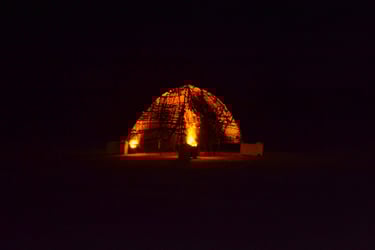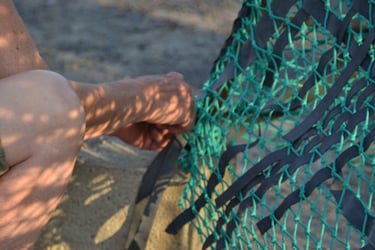 Dans cet espace entre zone humide et parking goudronné, se hisse fébrilement sur quatre pieds de béton usés une structure aux allures de cabane de chasseur ou de pêcherie à l’abandon. Les participant.e.s à cet atelier sont invité.e.s à venir tisser cette surface et donner corps à ce squelette. Cette pratique du geste lent et du temps long, invite à la discussion, à nouer des liens et à la rencontre des matières entre nos mains. Cette forme s’apparentant à un abri, vient questionner notre rapport à l’architecture, à nos modes d’habiter, aux matières que l’on utilise pour construire en proposant un refuge fragile fait de matériaux récupérés qui se consolidera au fil de ce tissage collectif.
